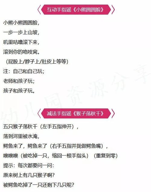 - 游戏环节:教师随机出示手指谣卡片,幼儿迅速找到对应的身体部位。